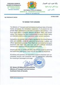 Khamiis 19 March 2026 {CBB}Wasaaradda Gaadiidka iyo Duulista Hawada ee Dowlad Goboleedka Koonfur Galbeed Soomaaliya ayaa ku dhawaaqday in si degdeg ah loo hakiyey dhammaan duulimaadyadii ganacsi iyo kuwa gaarka loo leeyahay ee ka bixi jiray kana imaan jiray dhammaan garoomada diyaaradaha iyo meelaha ay ka degto diyaaradaha ee deegaannada Koonfur Galbeed.