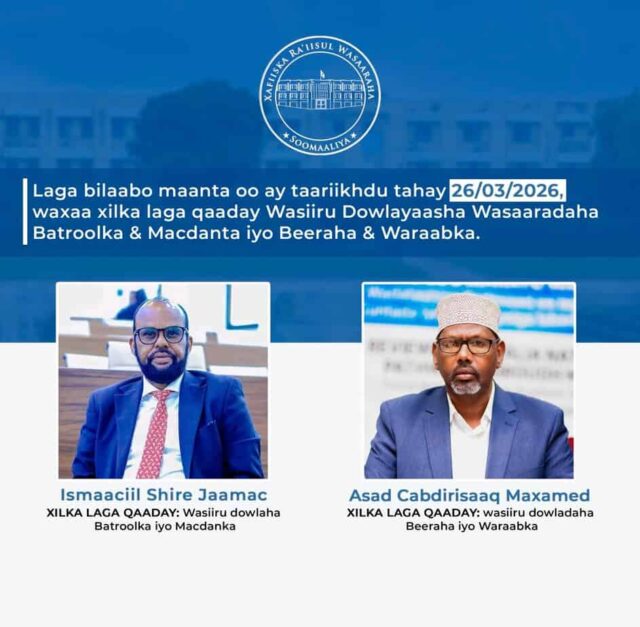 Ra’iisul Wasaaraha Xukuumadda Soomaaliya, Xamsa Cabdi Barre, ayaa xilalkii ka qaaday Wasiiru-dowlaha Wasaaradda Batroolka iyo Macdanta XFS Ismaaciil Shire Jaamac. Iyo Wasiiru-dowlaha Wasaaradda Beeraha iyo Waraabka XFS Asad Cabdirisaaq Maxamed.