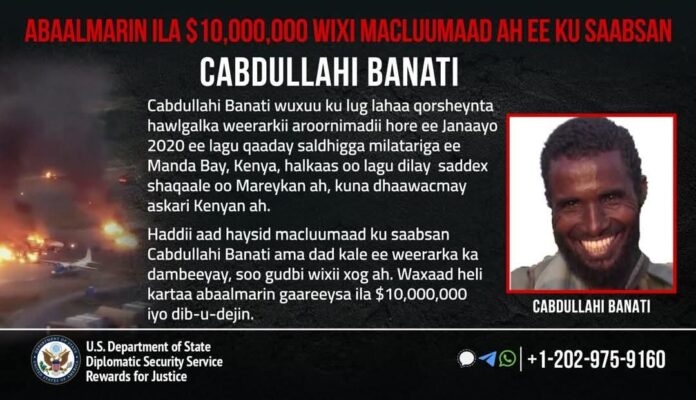 Khamiis 08, May 2025 {CBB}Waaxda Arrimaha Dibadda ee Mareykanka ayaa shaacisay abaalmarin lacageed oo gaaraysa $10 milyan oo doolar, cid kasta oo keenta xog lagu qaban karo Cabdullahi Banati, oo lagu eedeeyay inuu ka tirsan yahay kooxda Al-Shabaab isla markaana uu door muhiim ah ku lahaa weerarkii lagu qaaday saldhigga milatari ee Manda Bay, Kenya, subaxnimadii hore ee 5-tii Janaayo 2020.