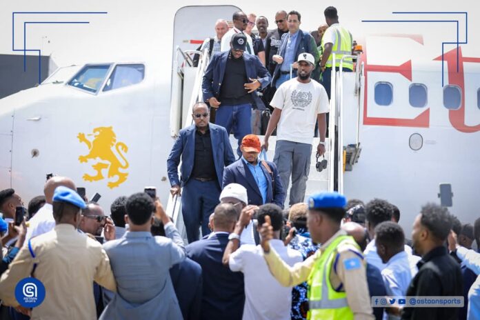 Wasiirka Wasaaradda Md. Maxamed Cabdulqaadir Cali oo uu wehliyo Gudoomiyaha Xiriirka Soomaaliyeed ee Kubadda Cagta ayaa ayaa garoonka diyaaradaha Adan Adde ku soo dhaweeyeen ciyaartooyda kala ah Samuel Eto’o, Emmanuel Adebayor iyo Jay Jay Okacha oo dalka soo gaaray.