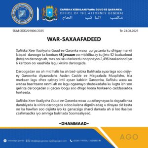 Ugu dambeyn, Xafiiska Xeer Ilaaliyaha Guud ayaa udigay cid kasta oo isku dayda inay ka ganacsato daroogada oo khatar ku ah caafimaadka iyo amniga bulshada Soomaaliyeed.