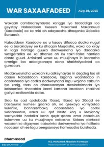 “Madaxweynaha waxaan ku adkeynayaa in degdeg loo sii daayo Nabaddoon Xaadoole, lagana waantoobo in cabashada iyo codka dadweynaha lagu wajoho caburin iyo xarig, taas oo dhaawacaysa dowladnimada iyo kalsoonida shacabka keeni kartana kacdoon khalkhal galiya xasiloonida dalka.” ayaa sii raaciyay qoraalka.