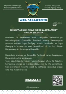 Axad 7 Sep 2025 {CBB}Hay’adda Sirdoonka iyo Nabad-sugidda Puntland ee (PISA) oo warsaxaafadeed kooban soo saartay ayaa beenisay warar ku saabsan in ay ka danbaysay dilka muwaaddin Reer Somaliland ah oo ku dhintay magaalada Hargeysa.