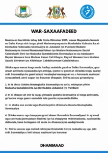 Home WARARKA MAANTA Puntland,Jubbaland iyo Madasha Samatabixinta Soomaaliyeed oo War-saxaafadeed wadajir ah Soo saaray. WARARKA MAANTA Puntland,Jubbaland iyo Madasha Samatabixinta Soomaaliyeed oo War-saxaafadeed wadajir ah Soo saaray. By editor - October 2, 2025 26 0 FacebookTwitterPinterestWhatsApp Khamis 2 Oct , 2025 {CBB}Maamulka Puntland,Jubbaland iyo Madasha Samatabixinta Soomaaliyeed oo War-saxaafadeed wadajir ah kasoo saaray shir ay ku yeesheen magaalada Nairobi.