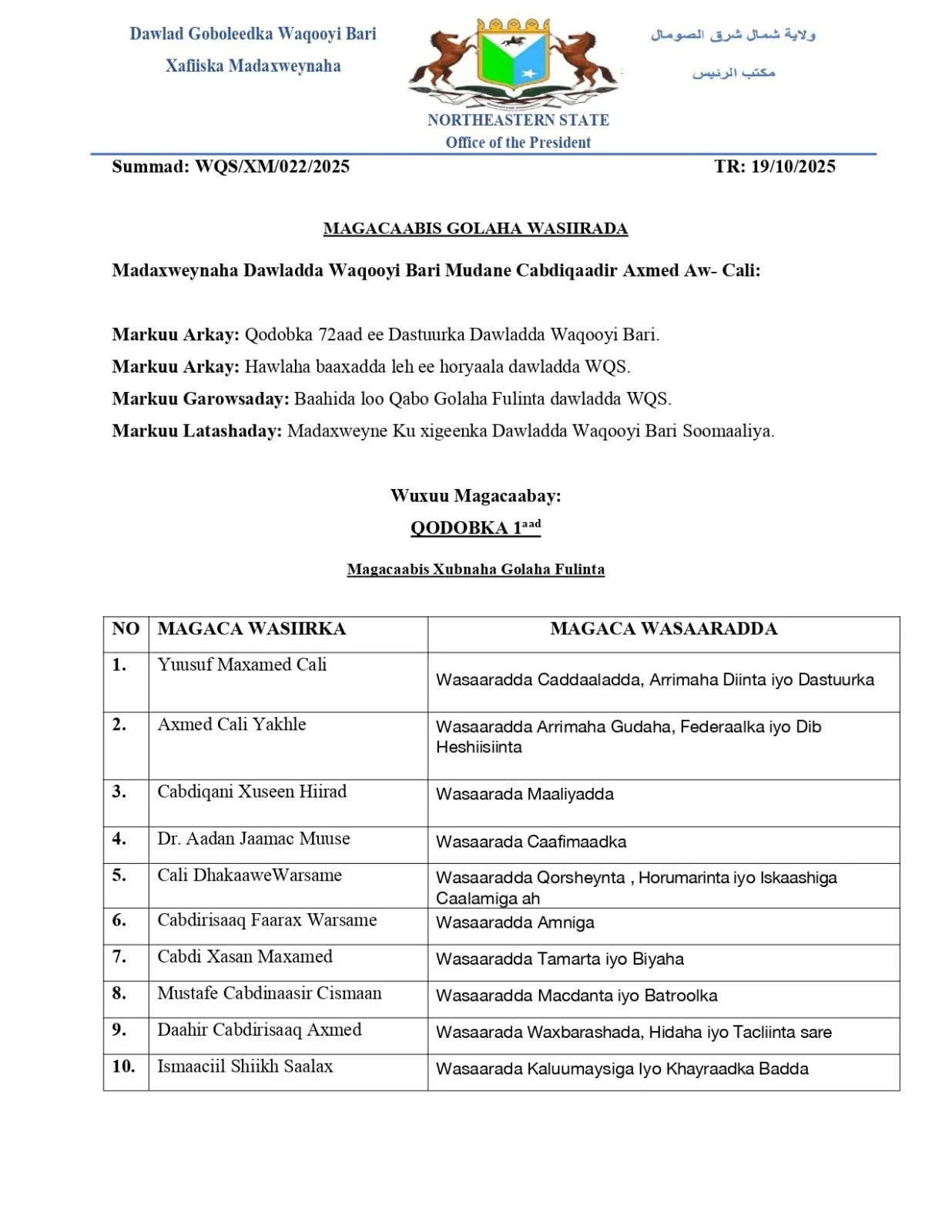 Isniin 20 Act 2025 {CBB } 1- Wasiirka Cadaalada & Arrimaha Diinta; Yusuf Maxamed Cali. Hayb ahaa waa Dhulbahante, Barkad.