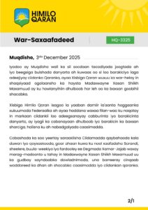 Arbaco, 3 Dec, 2025 {CBB}Xisbiga Himilo Qaran ee uu hoggaamiyo Madaxweynihii hore ee Soomaaliya, Sheekh Shariif Sheekh Axmed, ayaa warsaxaafadeed uu soo saaray kaga hadlay tacadiyada joogtada ah ee ka dhacaya magaalada Muqdisho, gaar ahaan beegsiga bulshada danyarta ah iyo barakicinta si loo banneeyo dhul ay ku doodayaan in sharci-darro lagu boobayo.