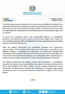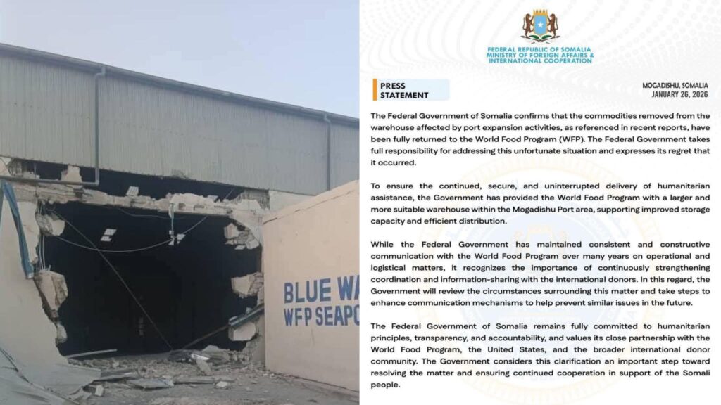Isniin 26 Jan 2026 {CBB}Dowladda Federaalka Soomaaliya ayaa xaqiijisay in dhammaan alaabihii laga saaray bakhaarka dekedda Muqdisho ee saameynta ku yeeshay hawlaha ballaarinta dekedda si buuxda loogu soo celiyey Barnaamijka Cuntada Adduunka (WFP).